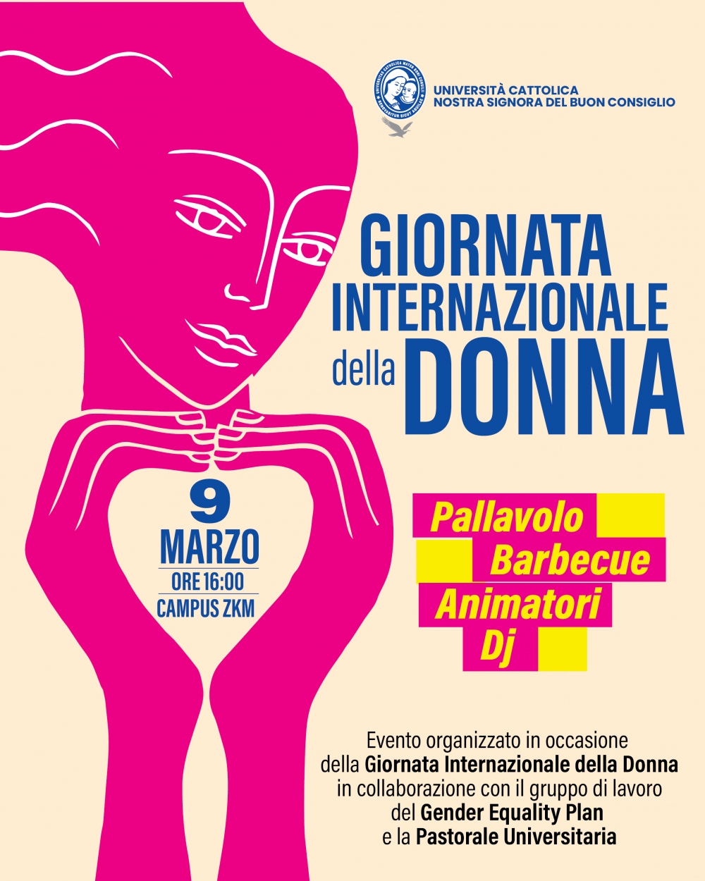 Il 9 marzo, in occasione della Giornata Internazionale della Donna, l’Università Cattolica "Nostra Signora del Buon Consiglio" organizzerà un’attività speciale che riunirà giovani, studenti/esse, donne e bambini per condividere momenti di svago, giochi, attività sportive, cibo e musica per tutte le età.