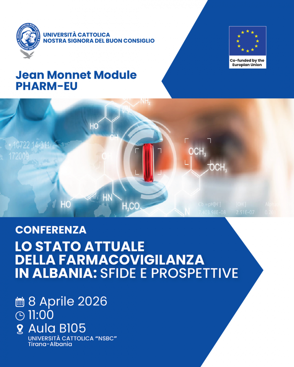 Në kuadër të aktiviteteve të projektit “Harmonizimi i Legjislacionit Farmaceutik Shqiptar me Direktivën Europiane të Barnave” (PHARM-EU), i cili bën pjesë në modulin Jean Monnet dhe financohet nga programi Erasmus+ i Bashkimit Evropian, më 8 prill 2026, në orën 11:00, në sallën B105 të Universitetit Katolik “Zoja e Këshillit të Mirë”, do të zhvillohet konferenca me titull: “Gjendja aktuale e farmakovigjilencës në Shqipëri: sfida dhe perspektiva”.