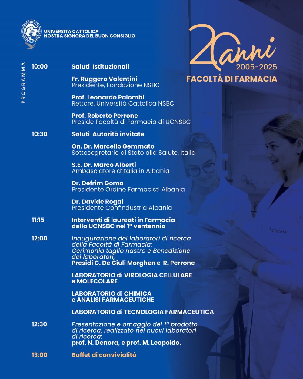 A partire dalle ore 10:00 si festeggerà il ventesimo anniversario della Facoltà di Farmacia dell’Università Cattolica di Tirana, simbolo di vent’anni di impegno, dedizione e innovazione nel campo dell’istruzione e della ricerca farmaceutica.