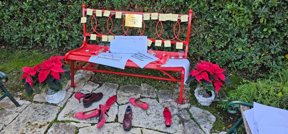 I nomi delle vittime, scritti su piccoli fogli, sono stati lasciati sulla Panchina Rossa, accanto alla quale sono state collocate anche delle scarpe, simbolo del 25 novembre, Giornata Internazionale Contro la Violenza sulle Donne.