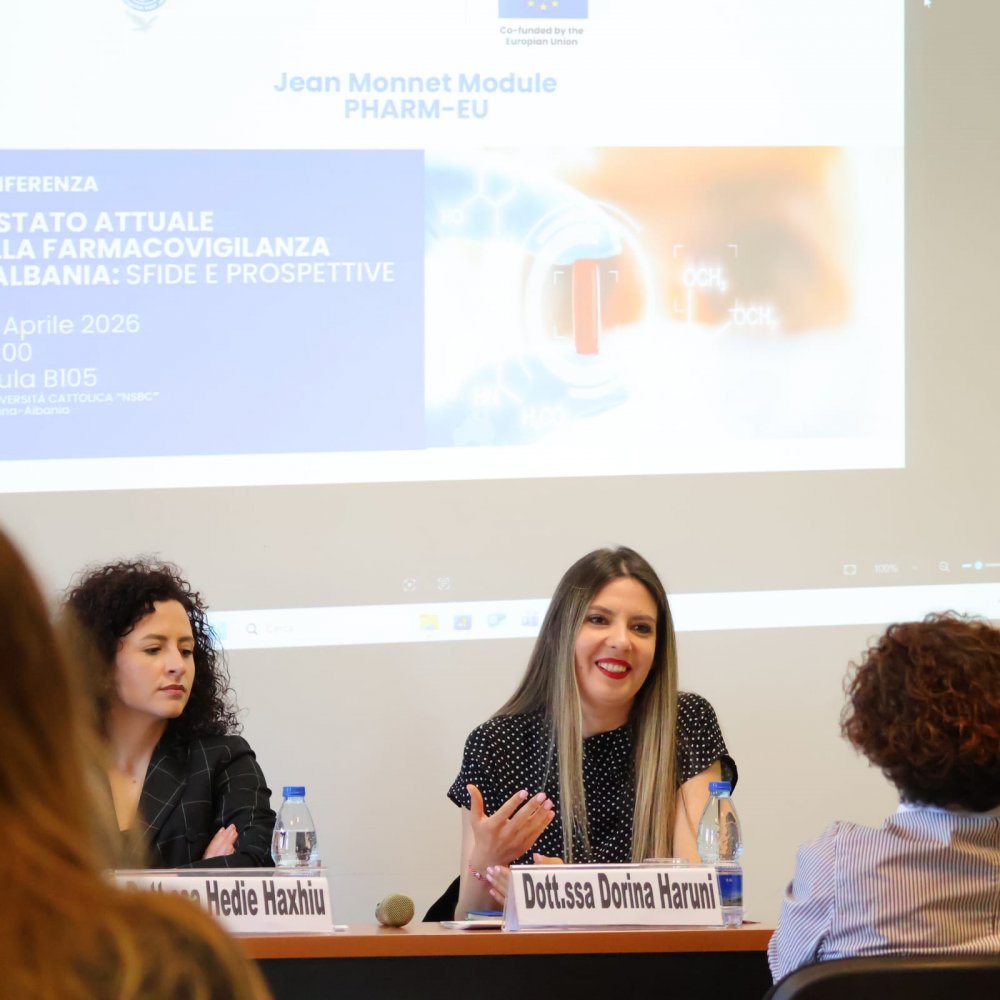 Within the framework of the activities of the project “Harmonization of the Albanian Pharmaceutical Legislation with the European Pharmaceutical Directive” (PHARM-EU), part of the Jean Monnet Module actions funded by the European Union’s Erasmus+ programme, the conference entitled “The Current State of Pharmacovigilance in Albania: Challenges and Perspectives” was held on April 8, 2026, at 11:00 a.m., in Room B105 of the Catholic University “Our Lady of Good Counsel”.