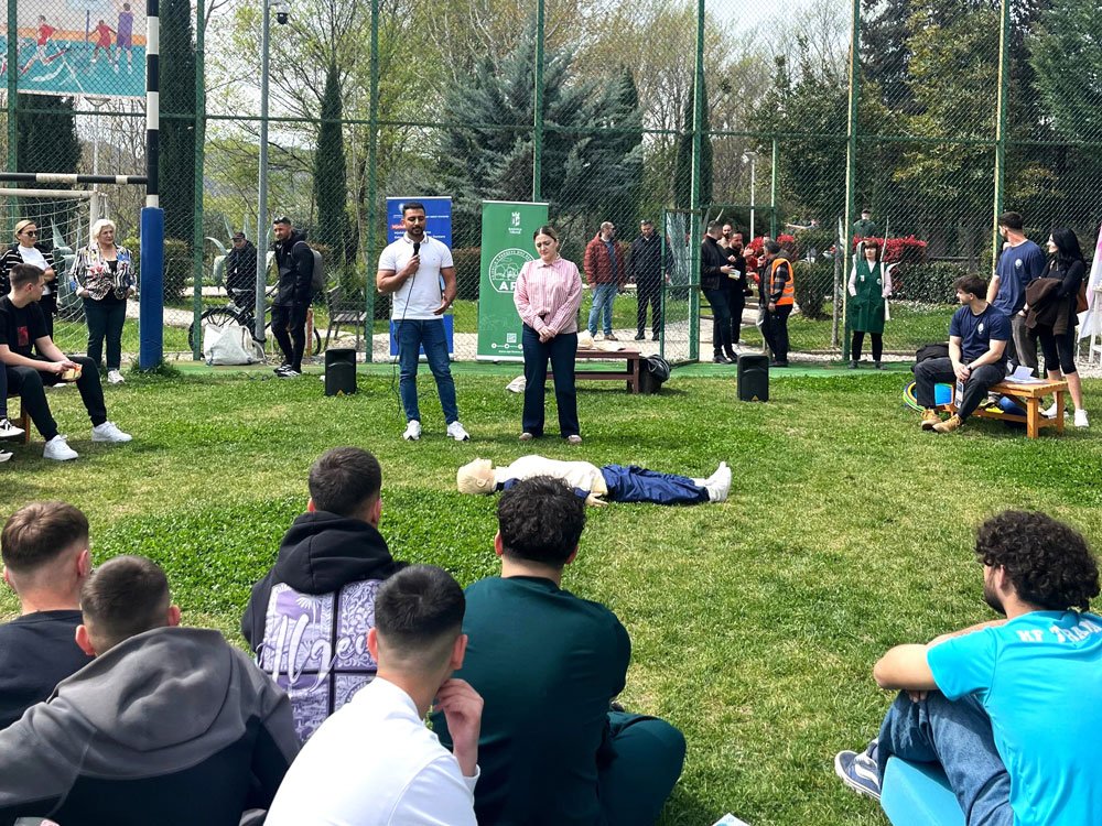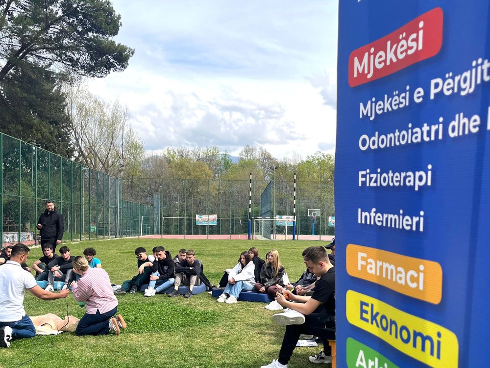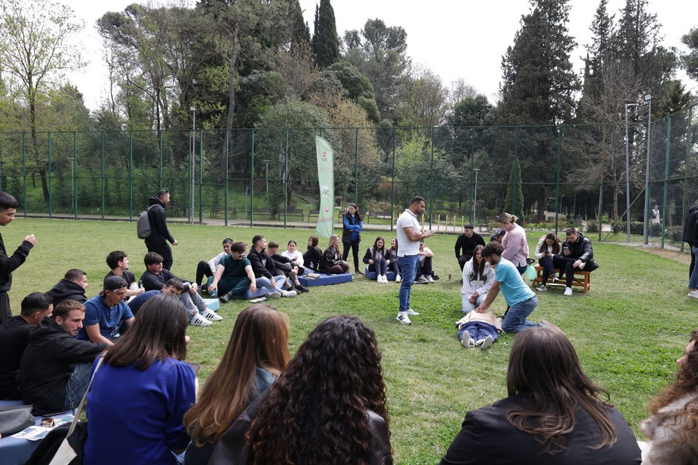 Dhjetra maturantë të Tiranës u bashkuan në Parkun e Madh të Liqenit pranë fushave shumësportëshe me ekipin e UKZKM për të ndjekur sesionet e hapura të trajnimeve për Ndihmën e Shpejtë dhe për mbajtjen e trupit drejtë.