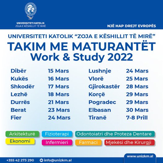 Dal 15 marzo al 8 aprile 2022 l’Università Cattolica “Nostra Signora del Buon Consiglio” parteciperà alla fiera “Work & Study” nelle città: : Dibër, Kukës, , Scutari, Lezhë, Durazzo, Berat, Lushnje, Fier, Valona, Argirocastro, Korçë, Pogradec, Elbasan e Tirana.